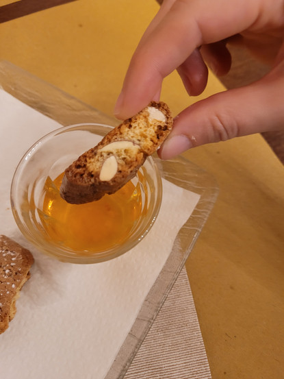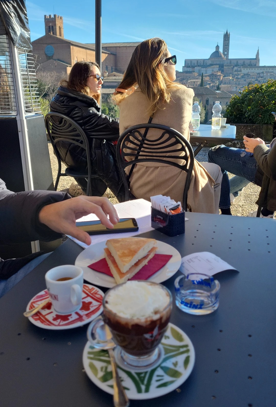 em ordem: affogato (sorvete com café), gelato, brioscia con gelato siciliano, tiramisù, cantucci e vin santo (il fine pasto toscano), cioccolata calda con panna, pandoro di verona e salame di cioccolato, cornetto, aragostine, focaccia, mozzarelline impanate, supplì, verdure grigliate, bruschette, pizza & birra, pasta al tartufo, gnocchi di patate, pici senesi, pasta ripiena, fagioli, pistacchio, vino toscano, spritz.